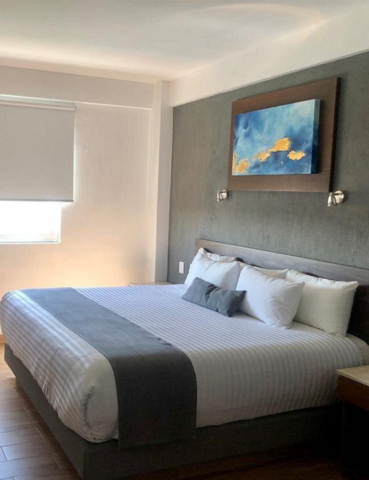 Habitación con cama King Size equipada con todas las comodidades que necesita. Una habitación práctica y cálida, con detalles de luz natural, vista a la ciudad, con tonos y amenidades que le invitarán a gozar el tiempo de trabajo o descanso en ella. Precio por Noche desde $930 MXN.
