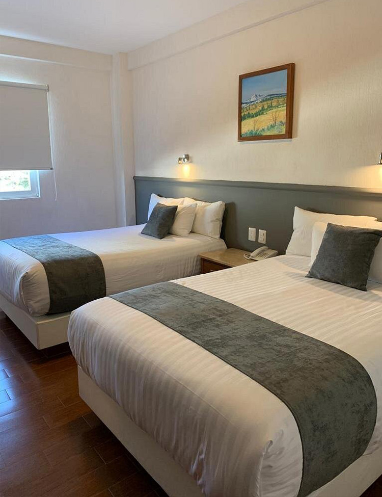 Habitación con 2 camas matrimoniales, equipada con todo lo que busca para su familia o grupo de trabajo. Esta habitación le brindará amplitúd, comodidad y placer al trabajar o descansar. La luz natural y una bella vista a la ciudad le harán disfrutar su estancia, compartiendo con colegas o familia. Precio por Noche desde $780 MXN.